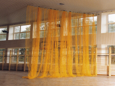 Schutznetze für Fenster und Wände, Fußballfangnetze und Netzvorhänge aus nicht brennbarem Baumwollgewebe oder -gemisch / Sektorenumzäunung von Hallen / in verschiedenen Farben, Webarten, geknotet